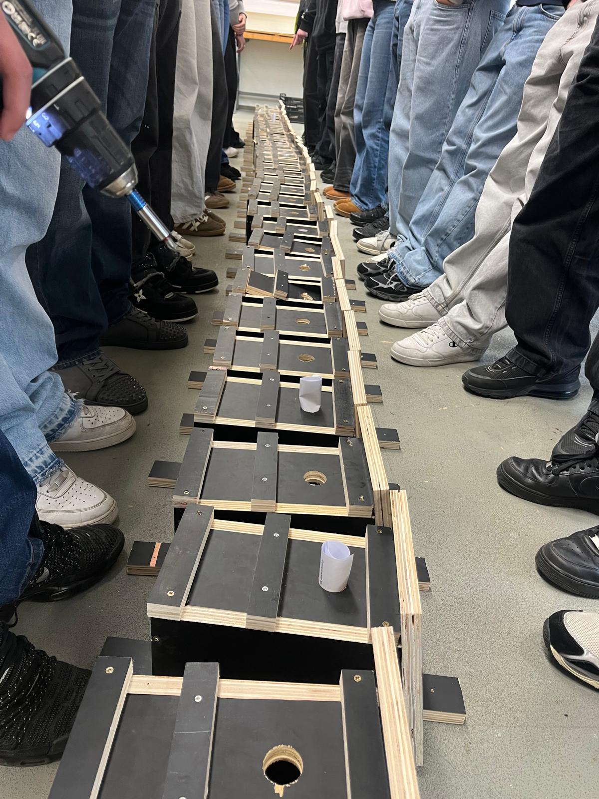 Im Anschluss stand das praktische Arbeiten im Mittelpunkt. Mit Säge, Akkuschrauber und viel Teamarbeit entstanden zahlreiche stabile Nistkästen. Die Schülerinnen und Schüler konnten dabei selbst erleben, wie aus einzelnen Holzteilen Schritt für Schritt ein fertiger Brutkasten entsteht.